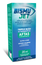 Bismu-Jet está indicado como medicação tópica auxiliar no tratamento de aftas e afecções bucais. Uso tópico. Uso adulto e pediátrico. Bismu-Jet está indicado como medicação tópica auxiliar no tratamento de aftas e afecções bucais. Uso tópico. Uso adulto e pediátrico. Consulte a bula.