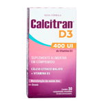 Calcitran D3 400UI é um suplemento alimentar composto por Cálcio (na forma de citrato malato) e Vitamina D3, indicado para o fortalecimento dos ossos e dentes. A Vitamina D3 presente na fórmula auxilia na absorção de cálcio e contribui para o bom funcionamento do sistema imunológico. Cada comprimido fornece 250mg de cálcio e 400UI de vitamina D3, sendo recomendado para uso adulto por via oral. A posologia sugerida é de 1 comprimido ao dia, podendo ser partido, se necessário. É contraindicado para pessoas com hipersensibilidade aos componentes da fórmula. Em caso de dúvidas ou condições clínicas específicas, consulte um profissional de saúde antes de iniciar o uso.